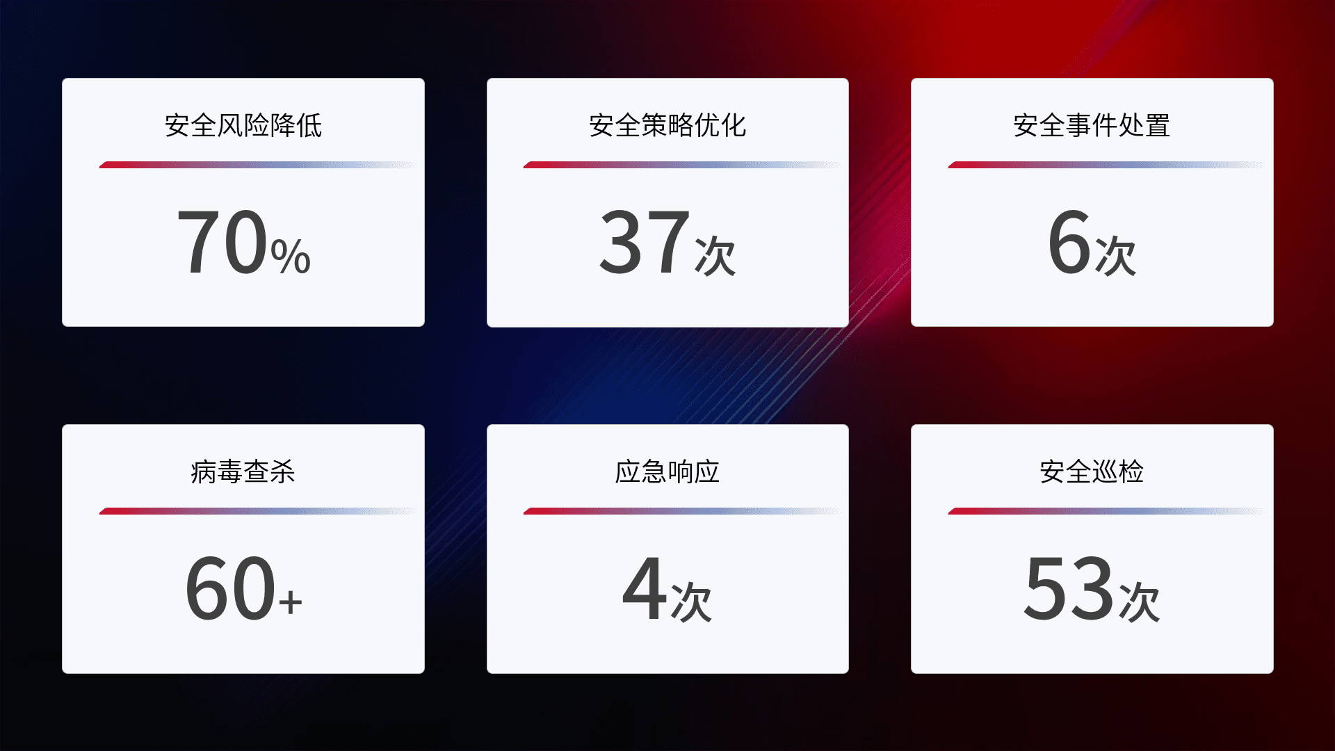 提供全面的安全事件报告体系,,,包括处置报告、、、周报、、、、季度和年度总结,,,,结合持续监控,,,帮助客户深入了解网络安全状况。。